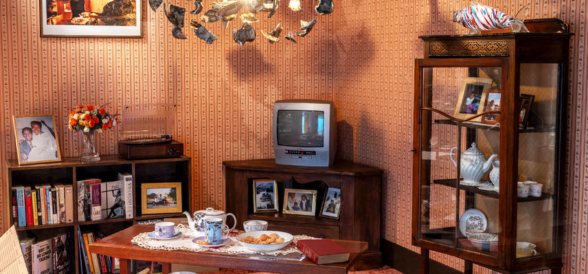 A team of Oxford‑based creatives collaborated with designers, artists, consultants and Museum staff to create the new Shedding light installation in this gallery. The scene pulls from a 1950s-60s Caribbean Living Room, reimagined with a contemporary twist.