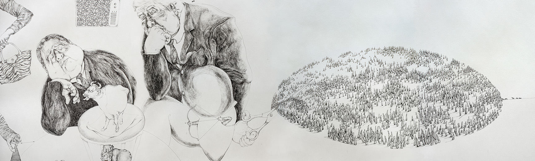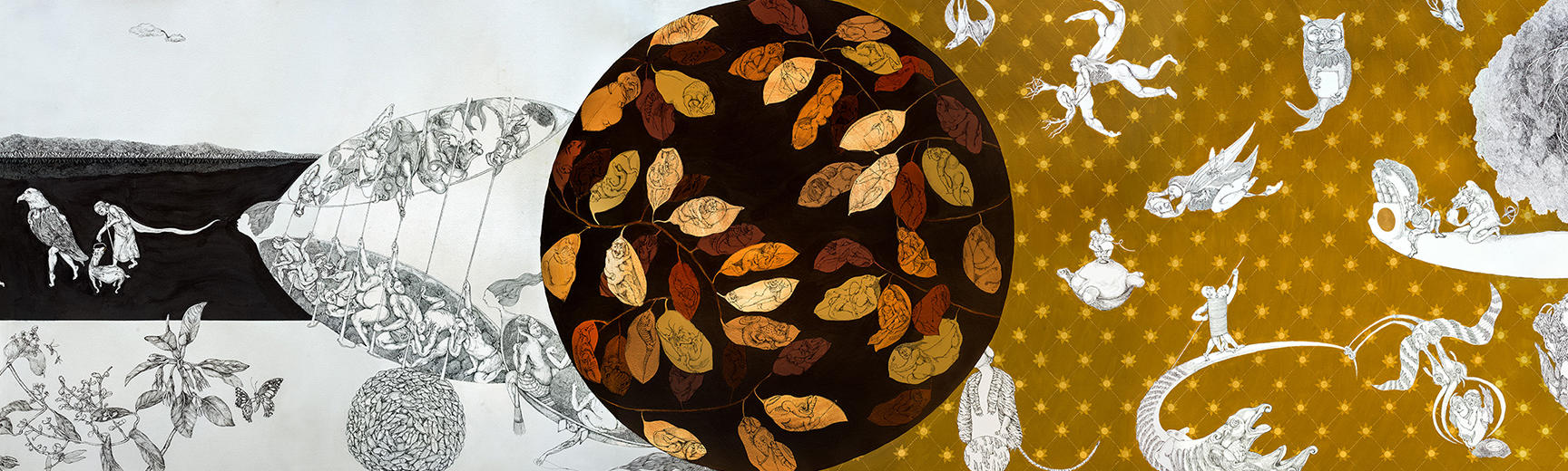 Between the Sea and the Sky, Who Holds the Ground? (sections), 30-ft scroll, Soma Surovi Jannat, 2024-25, archival ink pen on paper, acrylic colour, gold & silver leaf