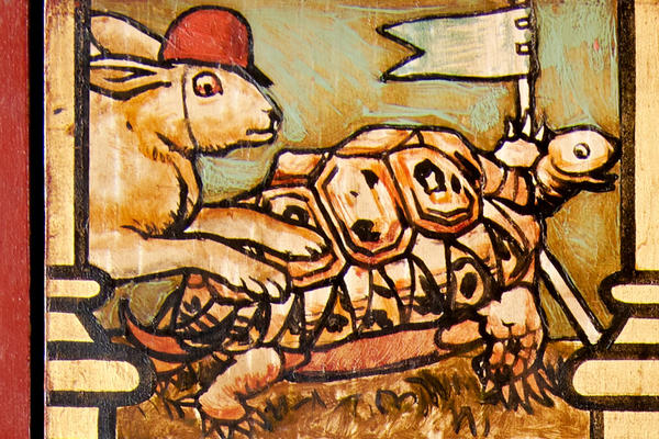 Hare with red hat (and the tortoise) on the Great Bookcase