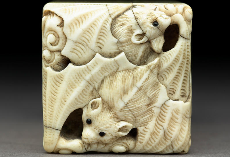 An intriguing object, this little 8cm tobacco container (or 'tonkotsu') is made from coconut shell with red lacquer and is carved with bat motifs. The bat is a symbol of good luck in Japan and China.
