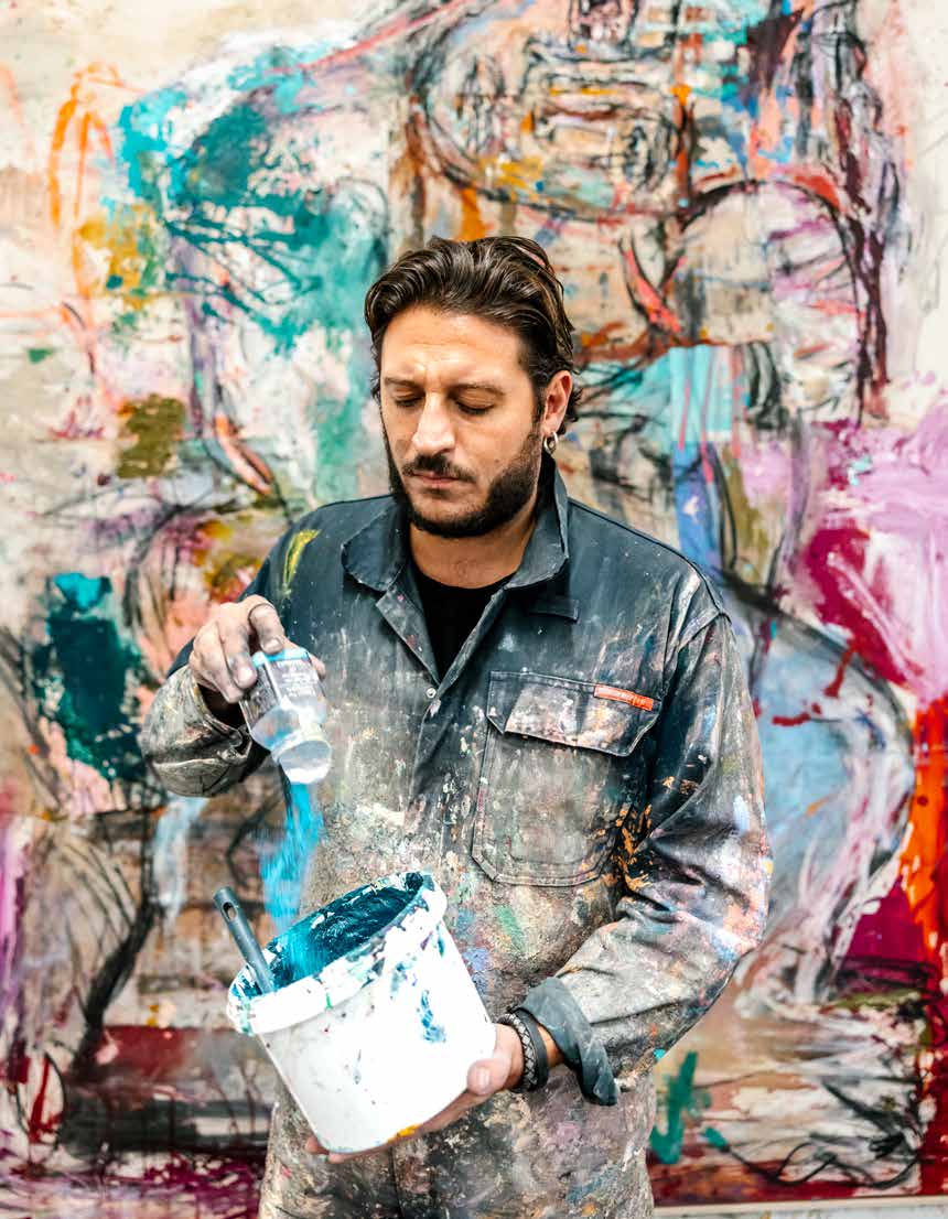 The textured patchwork of his canvasses gives Crews-Chubb’s monumental subjects a three-dimensional presence that, as he describes, ‘corrodes the boundary between painting and sculpture’.