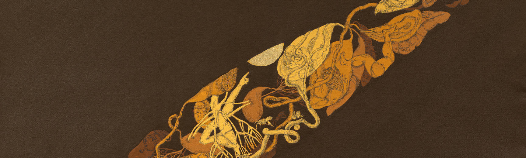 Beneath the Sea and Sky, Who Holds the Ground (detail sections), 30-ft scroll, Soma Surovi Jannat, 2024-25, archival ink pen on paper, acrylic colour, gold & silver leaf